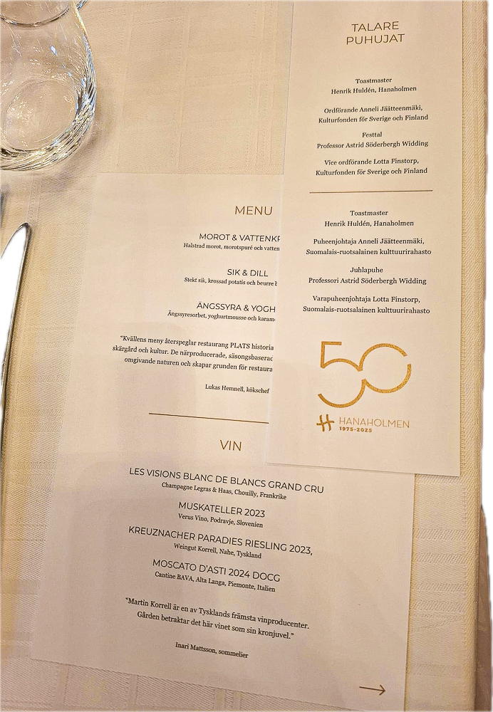 Na srečanju ob 50. obletnici sodelovanja med Finsko in Švedsko v spominskem centru Hanaholmen (Hanasaari) v kraju Espoo na Finskem, so na slavnostni večerji za aperitiv postregli z vinom Verus Rumeni Muškat letnik 2023.